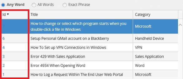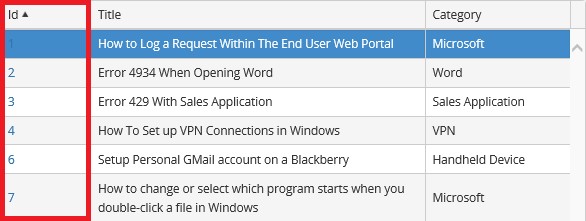 Articles will be sorted by any of these three categories. Sorting can be adjusted by selecting any of the column headers for Solution ID, Category or Title.