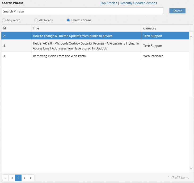 Users can search for Knowledge Base articles using one of several criteria:By Search Phrase