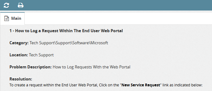 End Users can search for Knowledge Base or Best Solutions articles that are intended for resolving common issues. Solutions are submitted by Privileged Users in the Support Rep portal, which can be viewed by all users in ServicePRO.To access the Knowledge Base, End Users can select this option from the side bar.