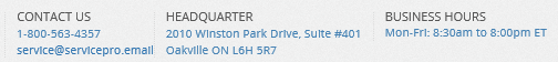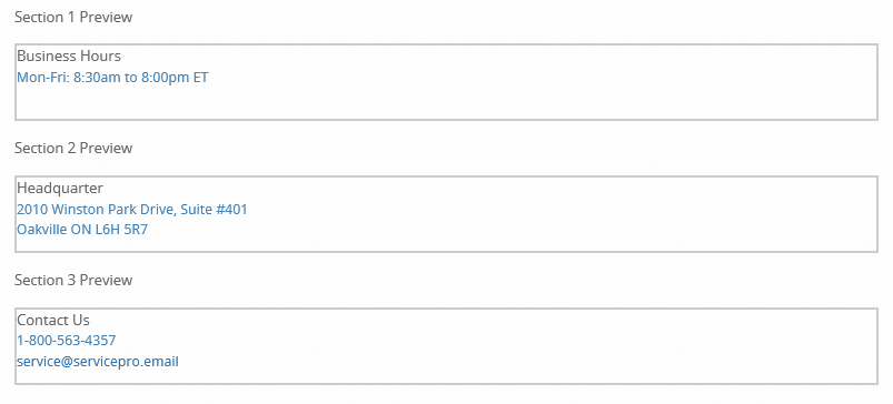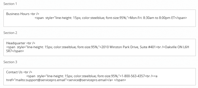 Content may consist of pure HTML code, including formatted text and images. By default, the initial available content includes business hours, company location, and contact information.