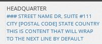 City [Postal Code] State Country This is content that will wrap to the next line by default