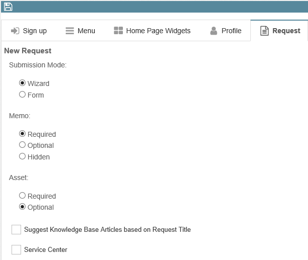 The request tab give options related to the request form view. This includes the submission mode default, memo related options, order of items on the wizard or form and field availability on request form.New Request