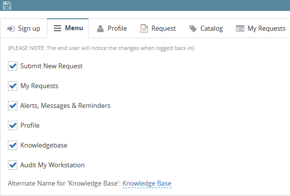 Enable or disable menu options for the End User. Note that End User will notice changes when logged back in.- Submit New Request