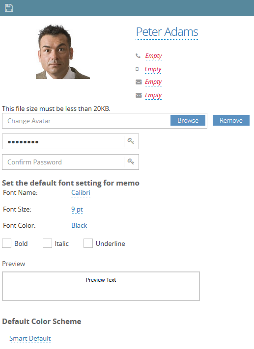 Enable or disable what options End Users can change on their User Profile page, as shown below. The User Profile can be accessed by opening the dropdown menu from the Username in the side bar and selecting Profile.