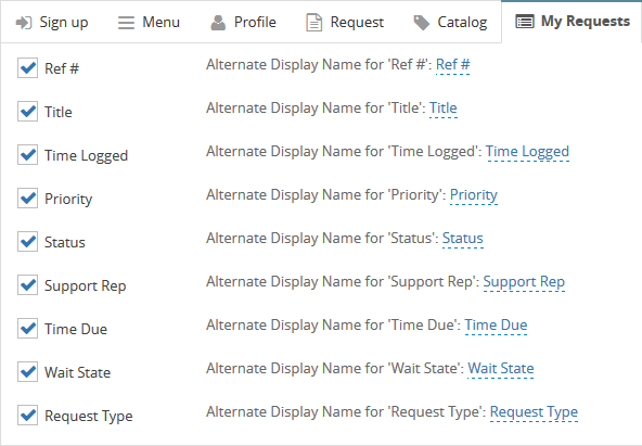 Enable or disable fields that appear in Request History or My Requests Listings. Furthermore, administrators can specify the label used by each field which is more easily understood by the end users.- Ref # – Edit the label used for Ref Number.