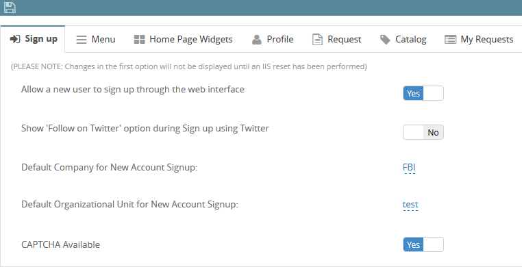 Edit options associated with the New Account Sign Up page.- Allow a user to sign up through the web interface