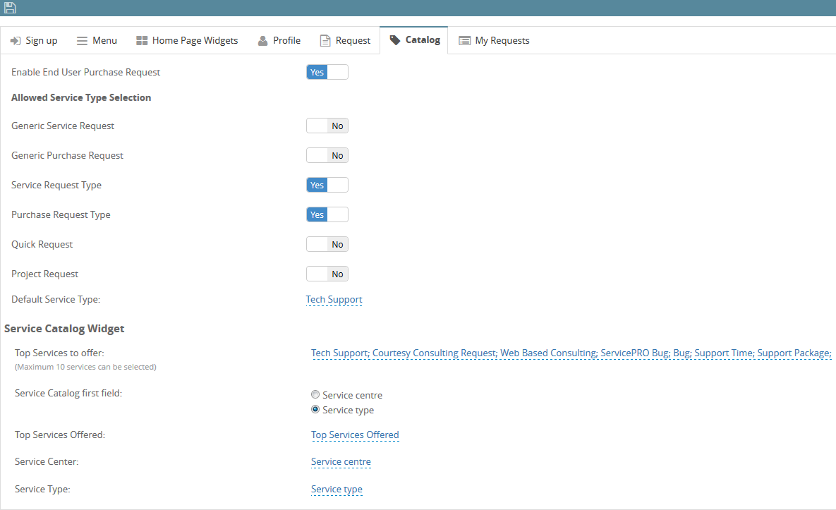 - Top Services to offer – Select from a list of available Service Types to display in the top field of the Service Catalog widget. Up to 10 "Top Services" can be selected and offered.