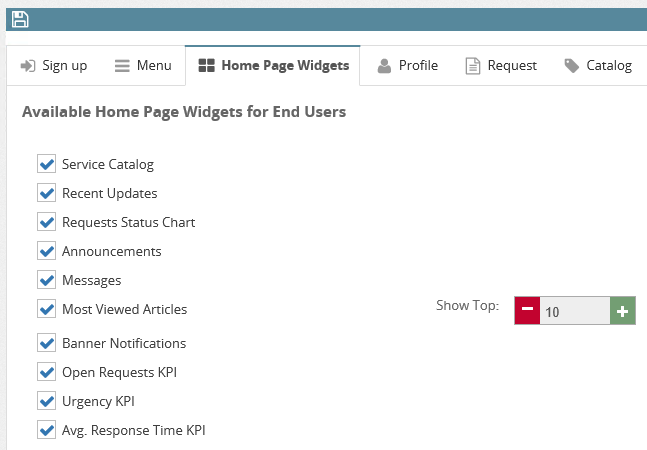 From this page, users can enable or disable Widgets on the ServicePRO Web Home Page. Please note that Widget settings for End Users and Licensed Users are set up individually.The following Widgets can be enabled or disabled by selecting the checkboxes from this tab. The Most Viewed Articles widget has a show top value input where values for top knowledge base articles to show can be specified as 5,10,15 or 20.