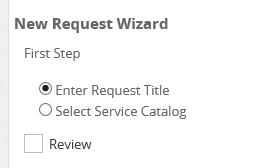 - Request Title – If the Request Title field is disabled, the First Step in the New Request Wizard will automatically be set to “Select Service Catalog”