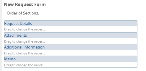 - Order of Sections – The new request form section allows you to sort the form sections that will be visible on the new request form (When submission mode is set to Form)