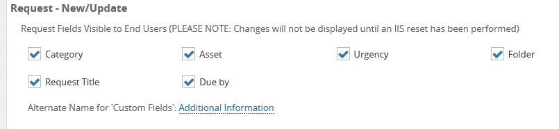 Changes made will require an IIS reset to reflect the saved changes. Please note that at least one of the field options must always be checked off: