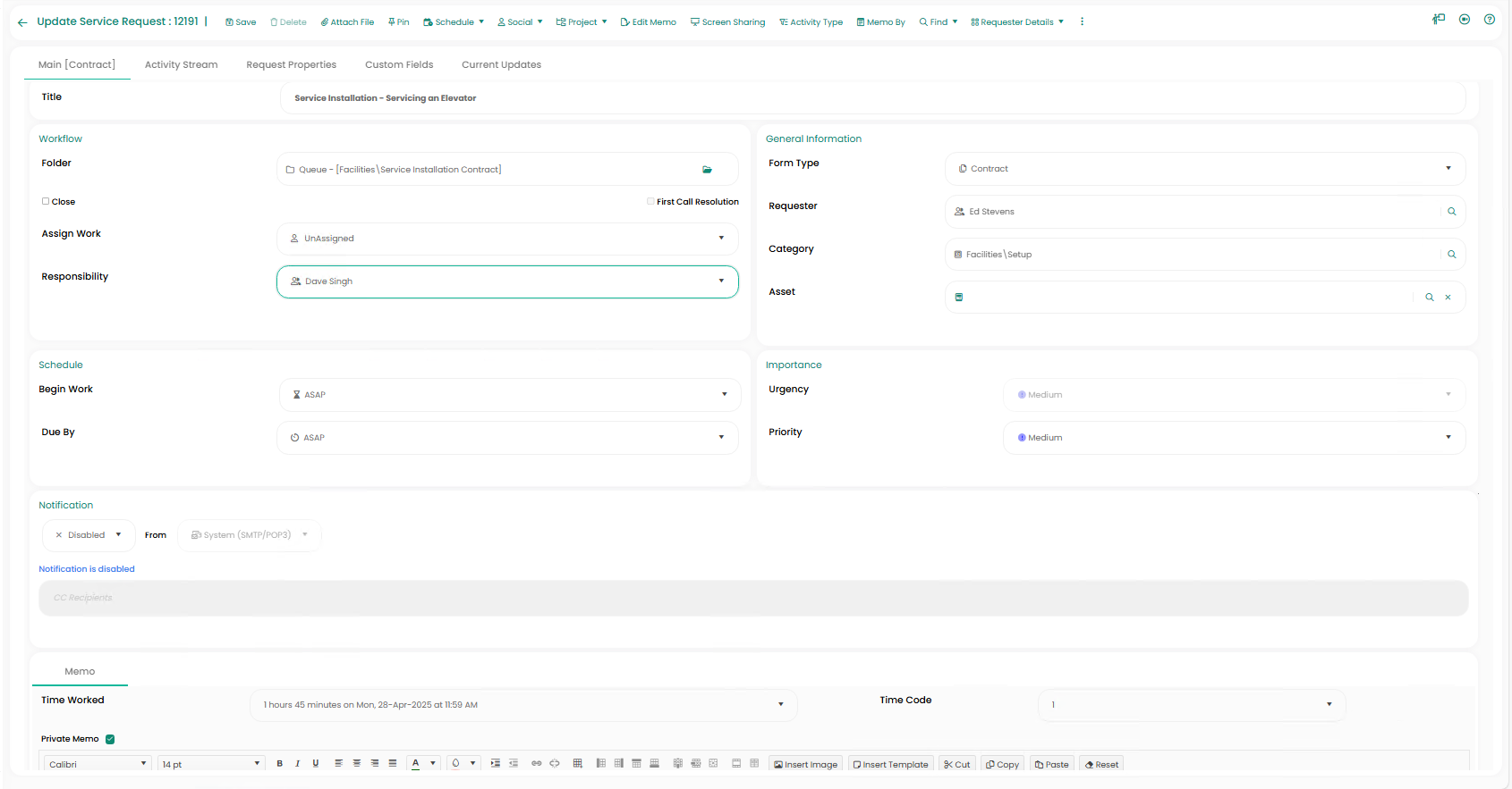 - Once an open request is assigned an Owner, the Time in Service counter begins.