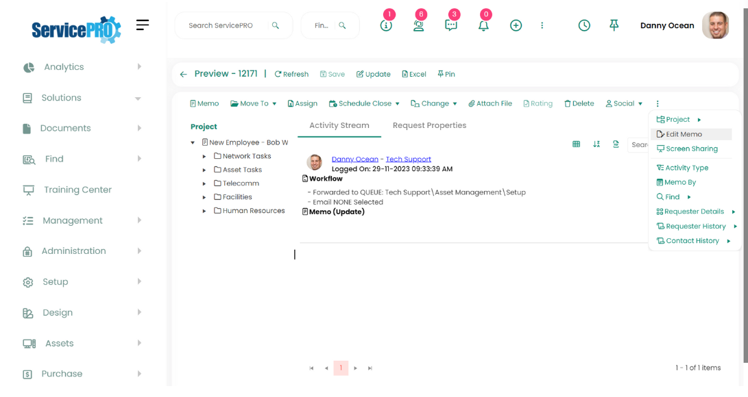 - Click on the three dots at the end of the Service Request Ribbon Toolbar. The Edit Memo window will open.