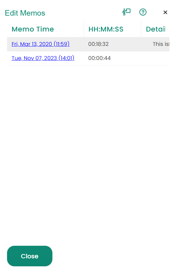 In this section, you can modify properties of a highlighted memo.- Time Worked: Modify the date or time worked on a specific memo.