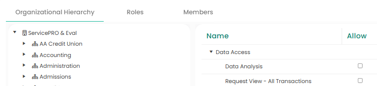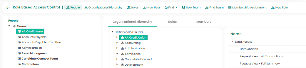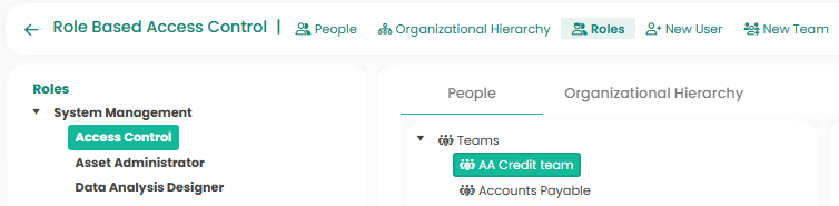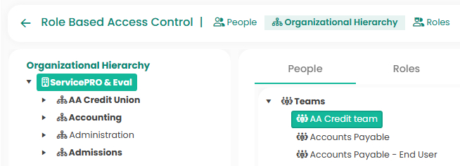 Selecting Organizational Hierarchy View will arrange People and Roles into tabs in the right pane.Organizational Hierarchies are categories overseeing the folders that users are assigned to, rather than the users who are part of those teams.