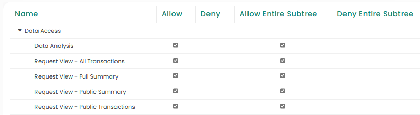 Permissions include categories such as Data Access, Request, System Management, and User Defined Roles. They also have subcategories that divide the permissions more specifically to further customize what a user can access.