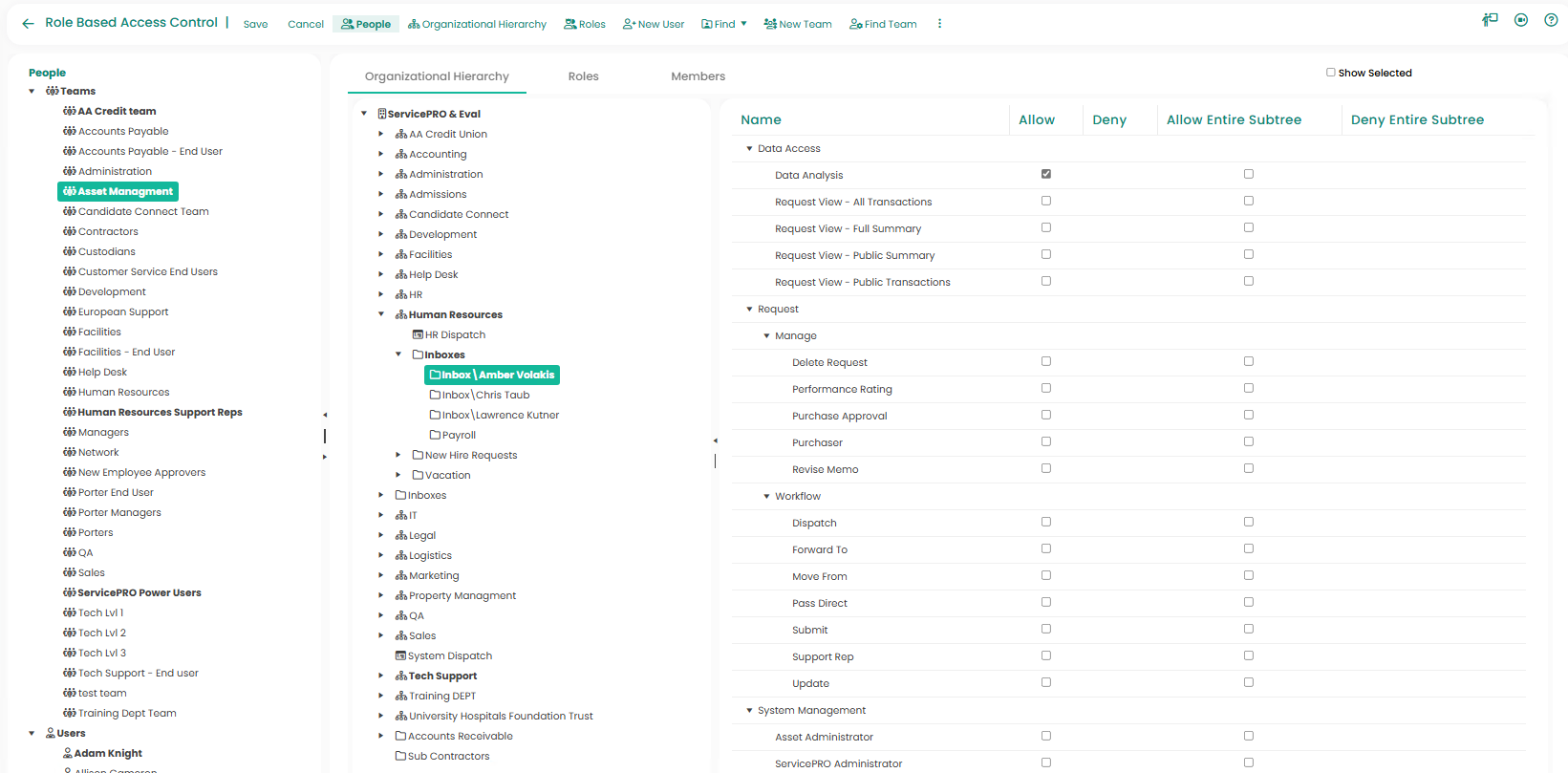 Though not explicitly labelled, Permissions is the third pane that appears in most Views of the RBAC module, except for when you are viewing the Team or Team Assignments tabs. Depending on which tab you have selected in the middle pane, you will view permission checkboxes for People, Organizational Hierarchy or Roles.This third pane allows you to set permissions with checkboxes for Allow and Deny respectively. There are also choices to Allow or Deny permissions for an entire Subtree.