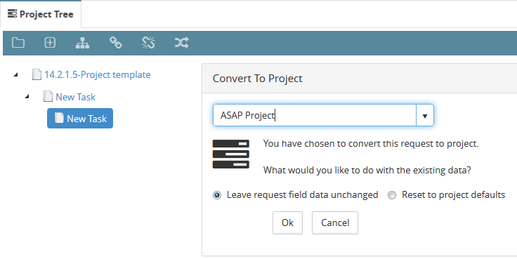 - Convert to Project – If a Child Request is deemed a standard Service Request type, it can be converted into a Project Request. Users can specify the type of Project Request to convert it into, and choose to keep field data unchanged or reset to project defaults.