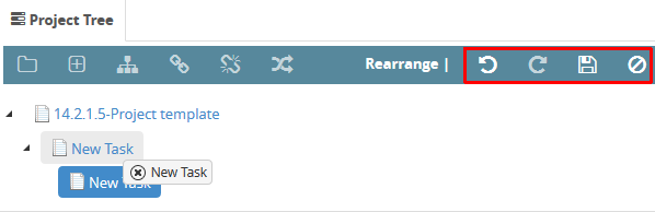 - Rearrange Current Project – Rearrange the order of the Project Request’s Child Requests. Users can drag and drop the request in and out of other requests/folders; a “+” icon will indicate that the request can be moved to another location, and a “x” icon will indicate it cannot be moved. While rearranging the current project, additional options are available from the header bar: