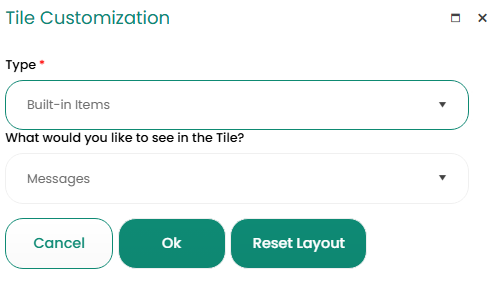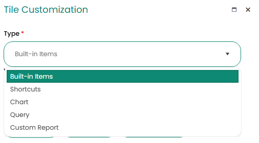 Selecting the Gear Icon will open the Tile Customization window. From this view, users can select items to display in a particular Tile. Users can select a Type, and select specific items to display based on the selected Type: