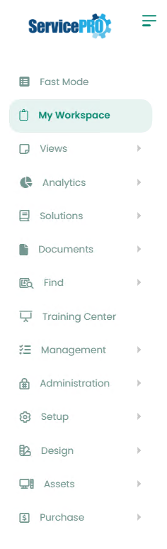 Selecting the "ServicePRO" logo in the upper left corner will open the Main Menu. This menu contains features such as request management and administrative options, organized into categories on the left sidebar.