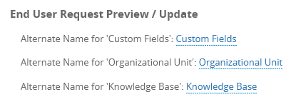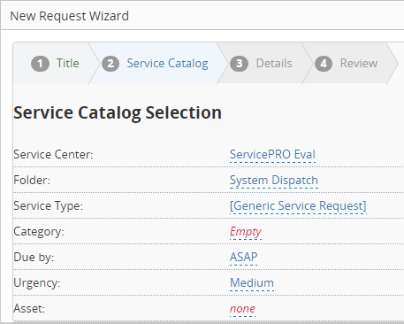 In the Service Catalog tab, enter criteria for how the Service Request should be categorized. The fields entered here will determine information such as the folder for the request, which department the request should be queued to, as well as provide additional information for Service Representatives.