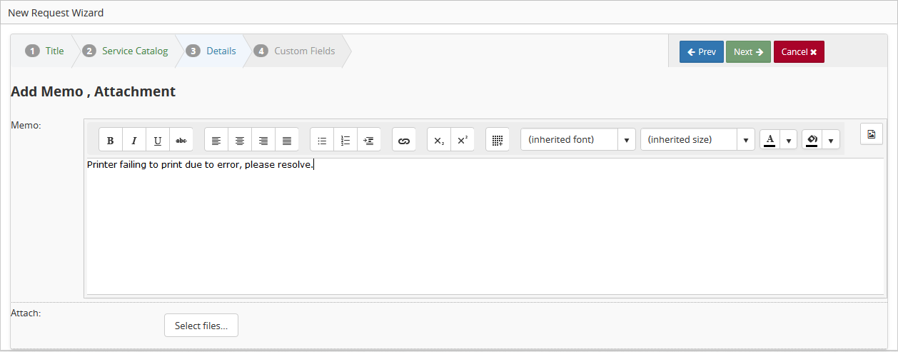 In the Details Tab, users can enter written details for their request in the memo, as well as include attachments.