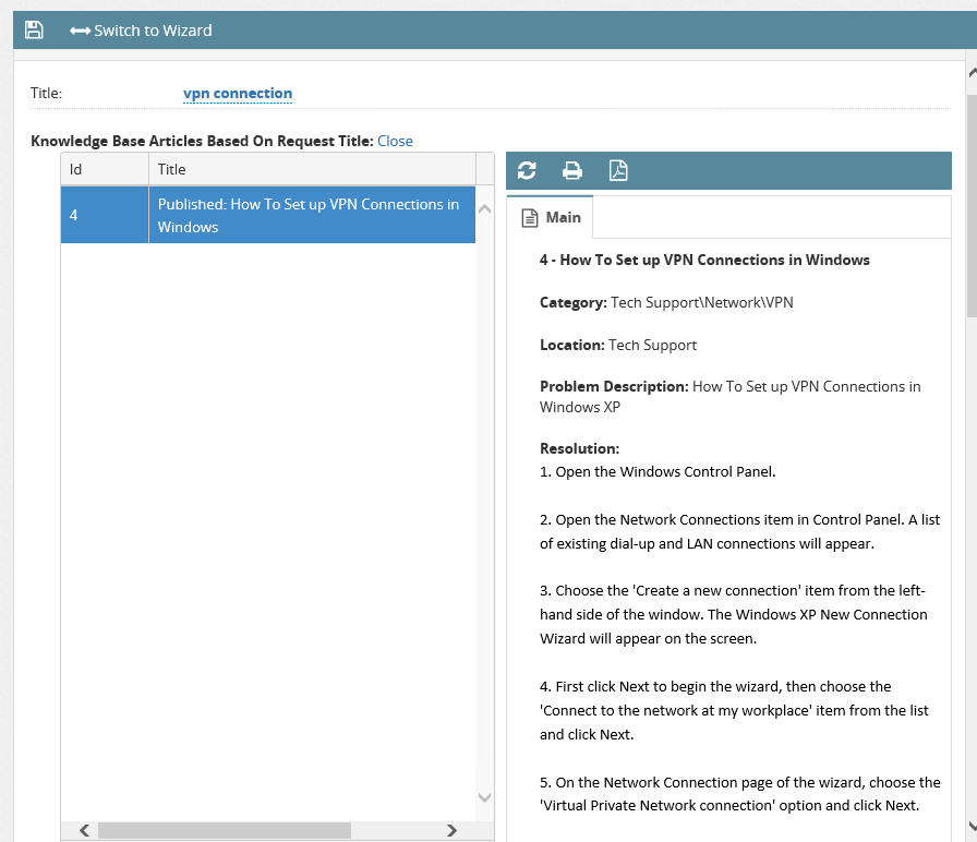 If the Knowledge Base article answers are not sufficient for resolving the issue, Users may proceed to the next step by selecting the Next icon.
