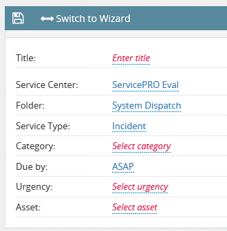 In the request details section, enter criteria for how the Service Request should be categorized. The fields entered here will determine information such as the folder for the request, which department the request should be queued to, as well as provide additional information for Service Representatives.