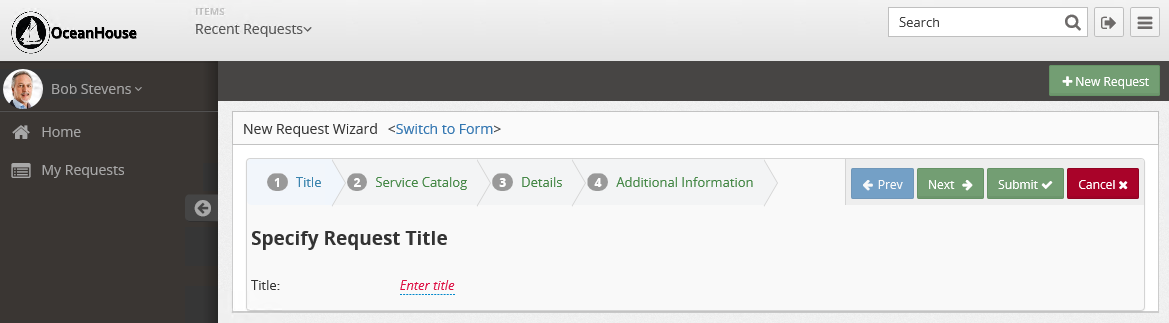 The New Request Wizard guides the user through submitting a new request. Users can navigate between each step using the Prev, Next and Cancel buttons on each page.