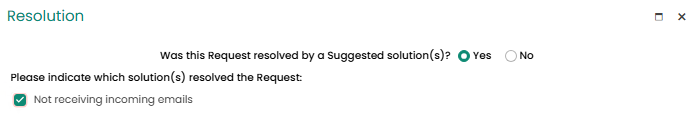 Select Yes, then select which solution(s) resolved the request. This is for statistical purposes and is an important indicator of the success of the best solutions article or the knowledge base in resolving requests.