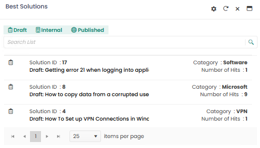 The Best Solutions Listing option displays the solution listing window. This window displays a list of draft internal and published solutions.Solutions exist in one of four states: