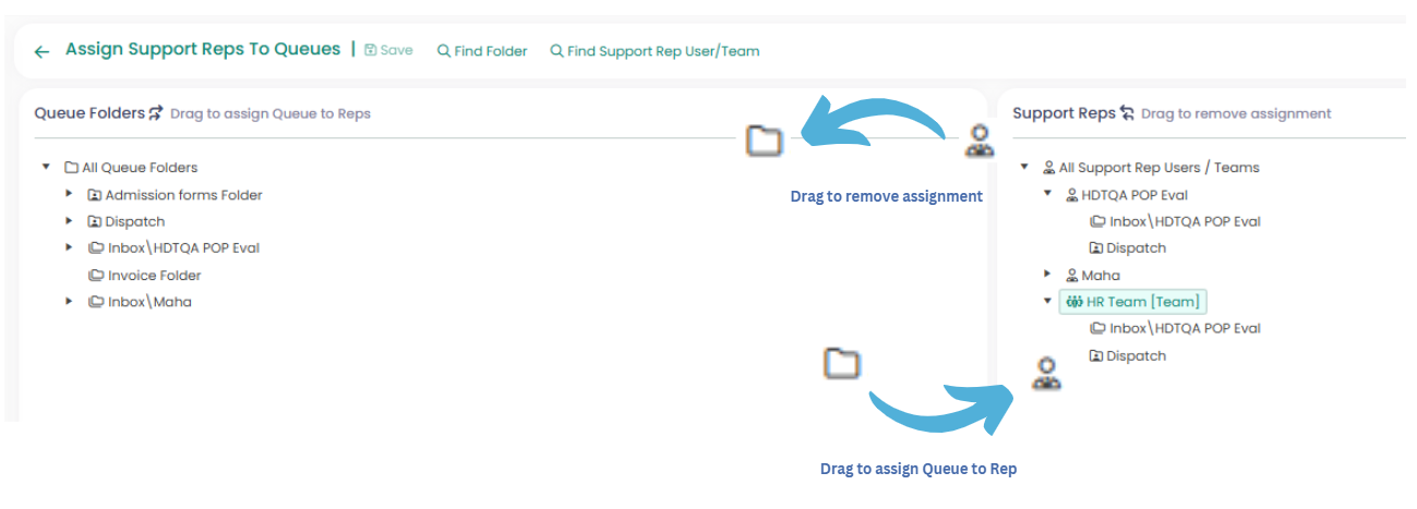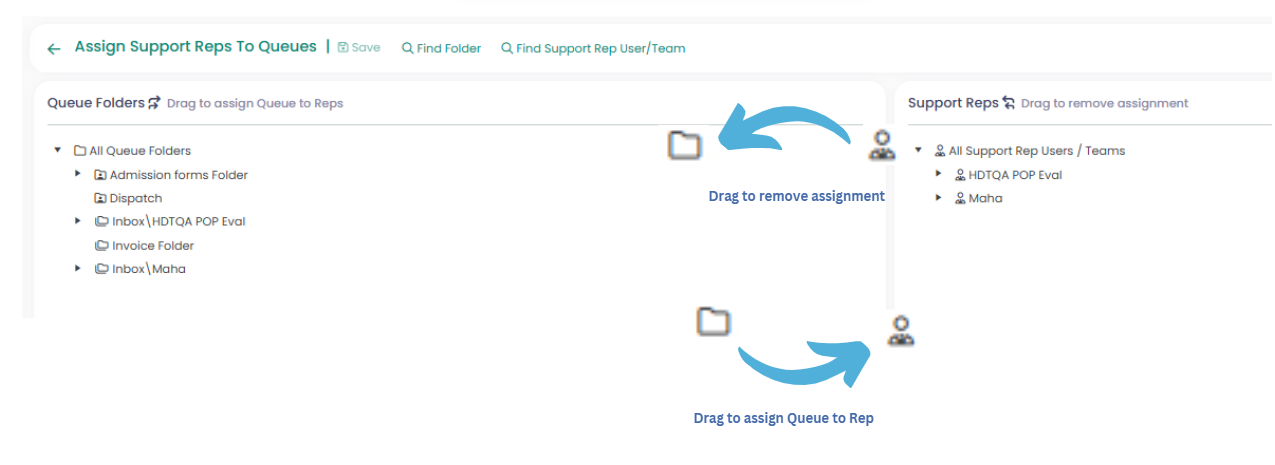 - To assign a rep or team to a specific queue, simply click on the Rep/Team name, drag and drop it to the queue folder which you would like the rep/team to be assigned to.