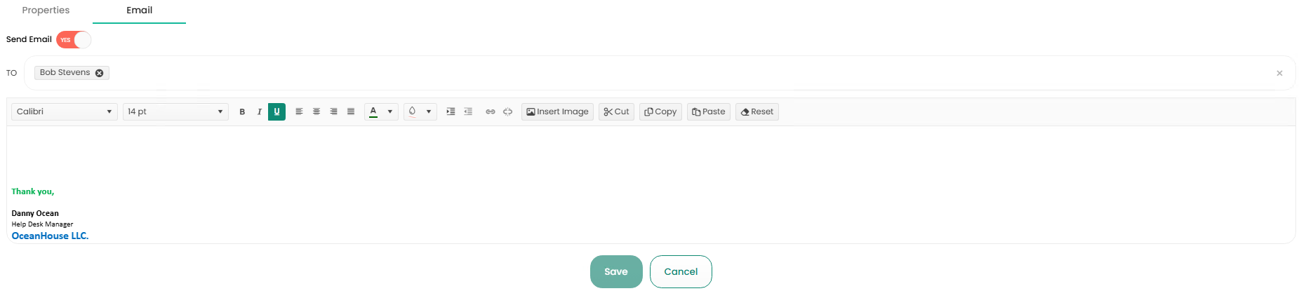 - To field – This field will be defaulted to the requester. The support rep will have the option to choose other user email addresses as recipients and the field has autocomplete feature enabled.