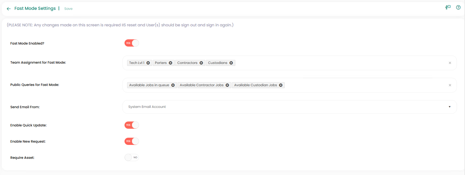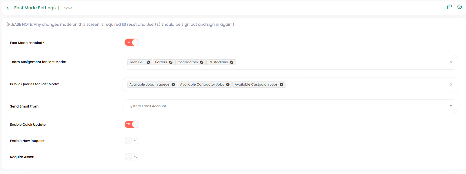 When Fast Mode is enabled, ServicePRO administrator will have three additional options to configure: