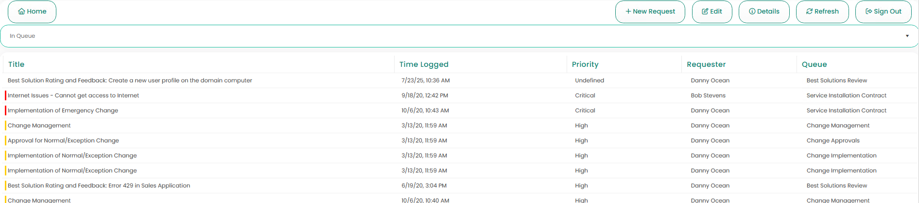 - In Queue – Shows all the requests “In Queue” Status for current user.