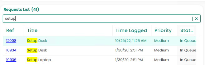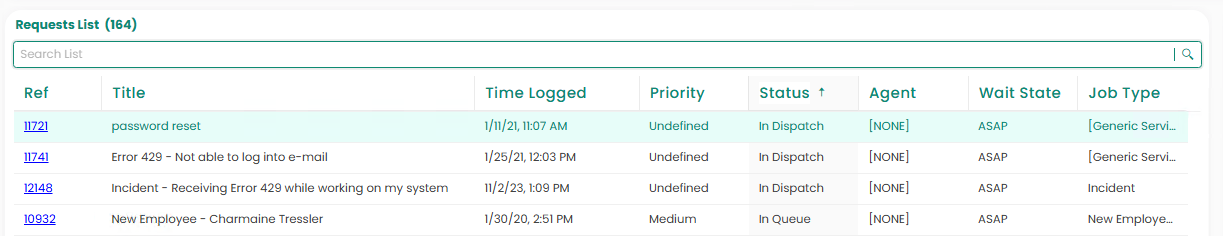 Users can use the list headers to sort their request listing and the filter option to filter the type of request shown on list.Users can also choose to Search for specific requests in the search bar of the Request Listing pane. Service requests can be viewed in detail mode by clicking on the ref # hyperlink.