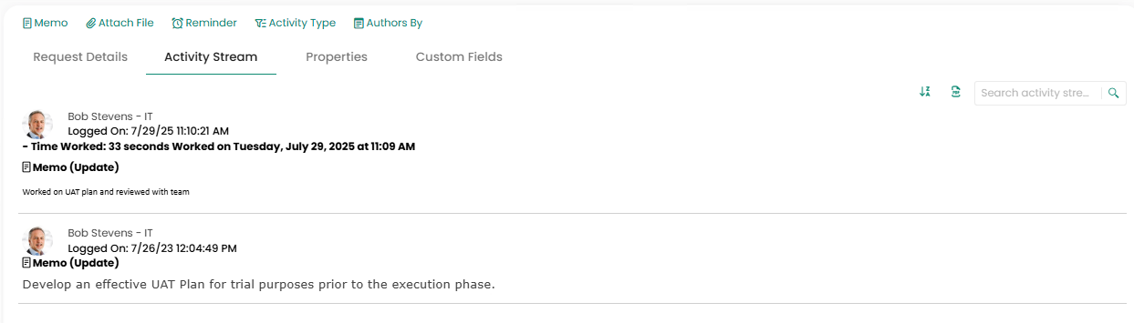 From the Request Preview Pane, users can choose to perform a variety of actions, including view Request Details, view a timeline of memos and messages associated with the request, and search the activity stream using criteria such as Activity Type or Author name.