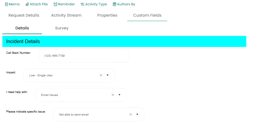 In the Memo Tab, Users can use this area to provide a complete description of the problem, details of the work carried out by Support Reps, and specifics about the problem resolution