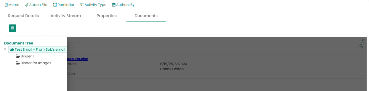Users can attach and upload files to the request by clicking on the + button beside "Attached File(s)". Attached documents and files will be available for viewing from the Documents Tab at the top of the Preview Pane.