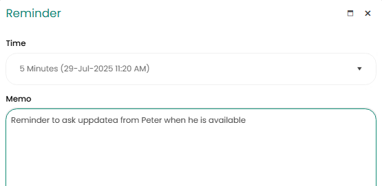 In this tab, Reminders can be accompanied by a Memo. Reminders will be displayed in a notification in ServicePRO at the designated time.