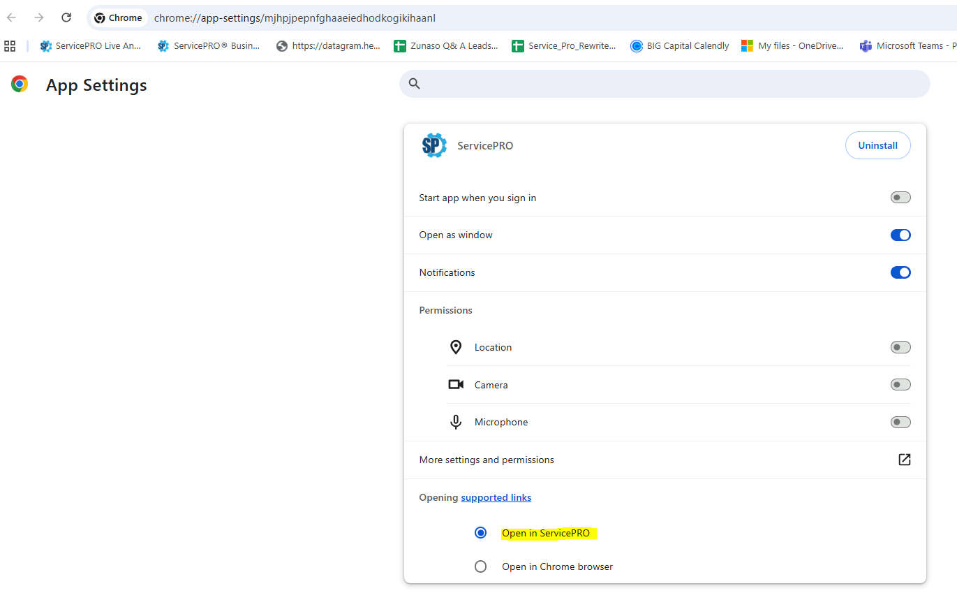 Even if it opens in a browser tab, you will get the option in the URL Bar to open in app as shown below: - In cases where the application is opening certain pages in a separate browser tab by default (options listed below), it’s not following the setting for opening in a new ServicePRO app window, and so it opens in a browser tab instead.