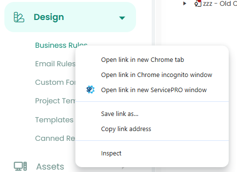 - In places where the right click context menu option is available, the option to open link in new servicepro window is available (for eg: “Business Rules” view in Navigation Panel menu as shown in the picture below), it opens fine in a new ServicePRO app window.