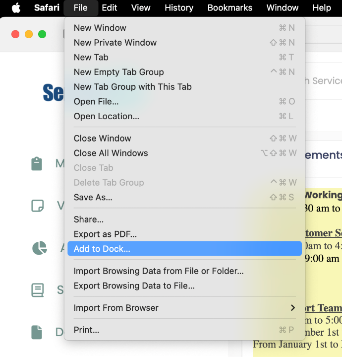- Use the “Add to Dock” option to install ServicePRO web application as an app.