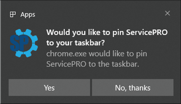 - After you click on the “Install” button, the below prompt is displayed. If you would like to pin “ServicePRO” to the taskbar, please click Yes on this prompt.