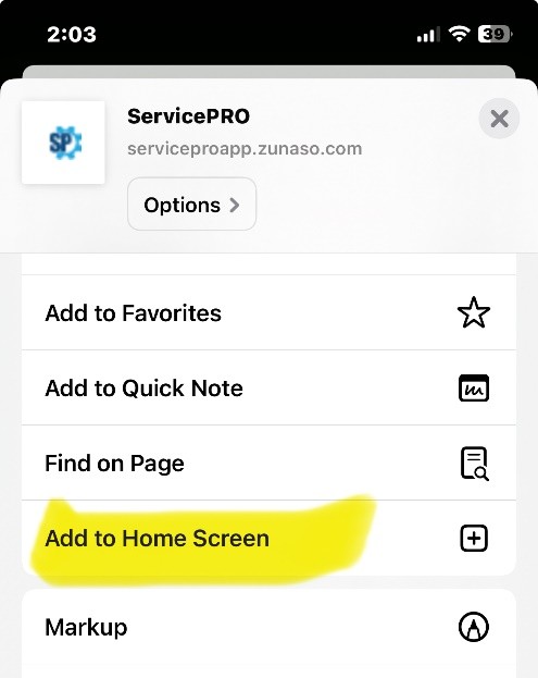 For iOS devices, ServicePRO Application can be added to the Home Screen for easy access through your Safari browser.- Open Safari.