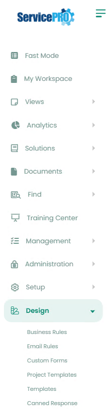 To design Custom Service Requests and templates in the Interactive interface, open the lefy-hand side main menu, and select the Design tab.Pages in the Section