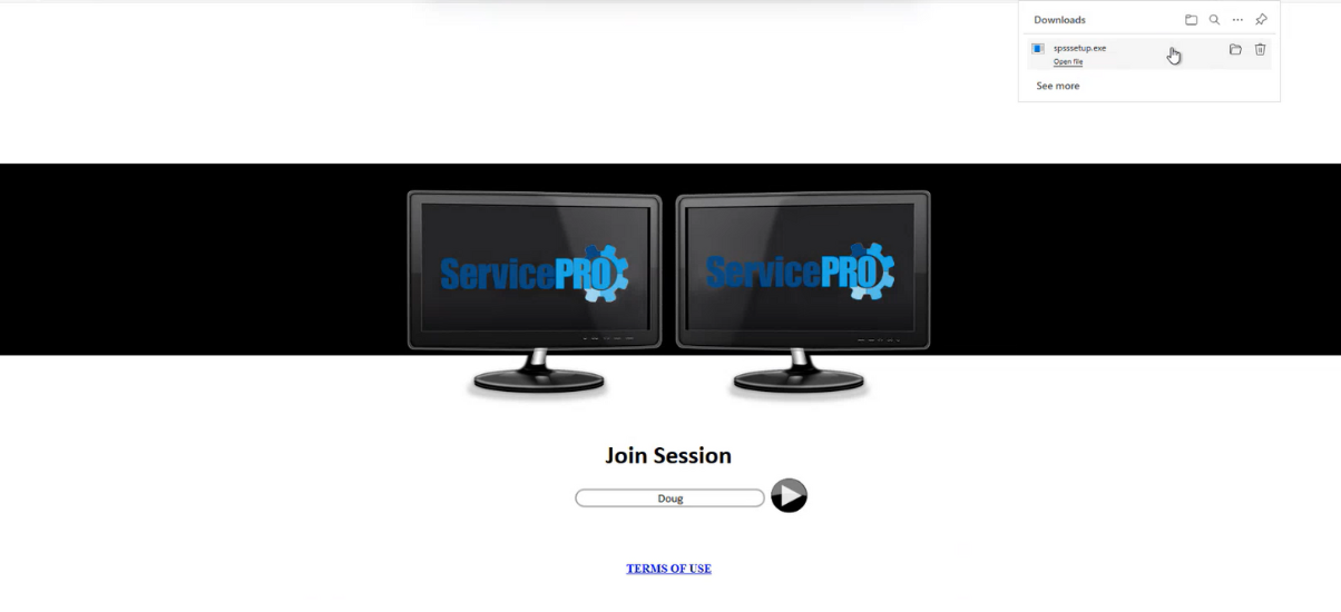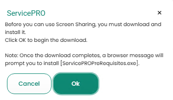 - Selecting OK will initiate a download for ScreenSharingClient.exe. This will allow you to install ServicePROPreRequisites.exe.