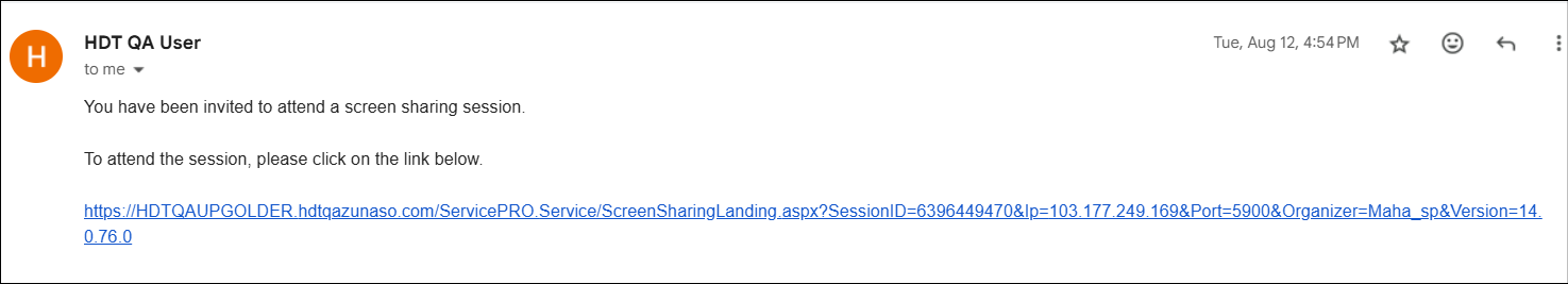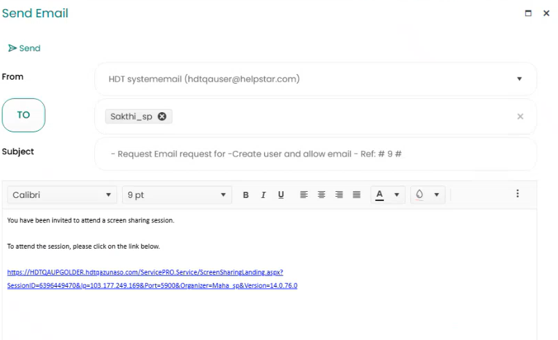 - The following email template will appear, containing the link for the viewer to click to attend the screen sharing session. Once sent, the viewer will recieve the link in their mail email inbox.