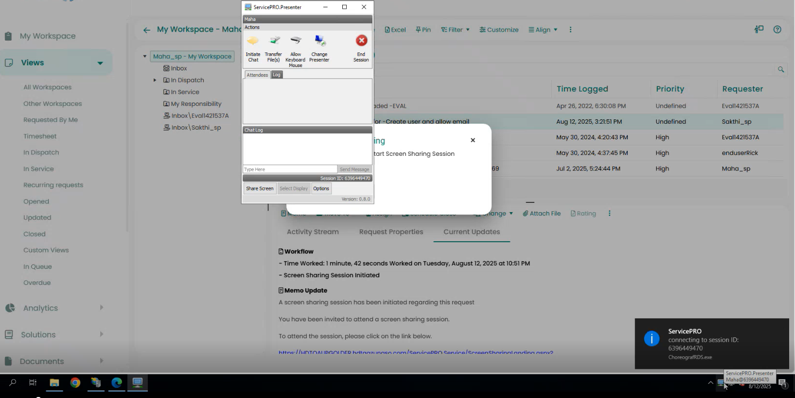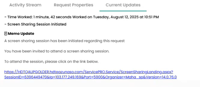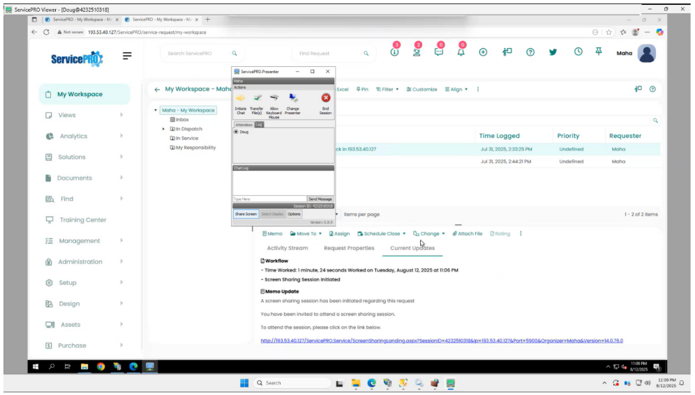- Select Screen Sharing from the Ribbon toolbar of a service request: